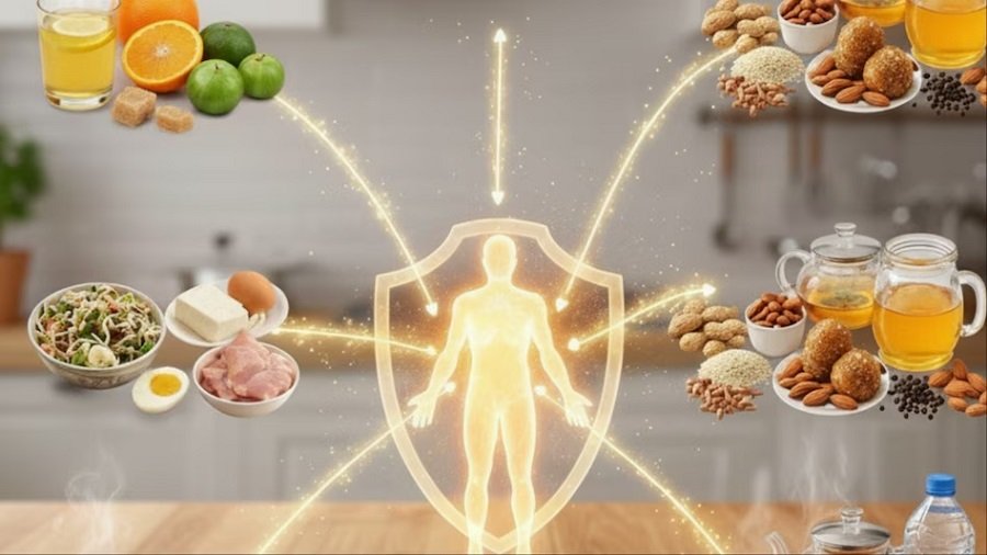 विटामिन C इम्यून सिस्टम को बूस्ट करता है और सर्दी और खांसी जैसे मौसमी इन्फेक्शन से बचाने में मदद करता है। संतरे, नींबू, अमरूद और हरी सब्ज़ियों को नियमित रूप से शामिल करें।
